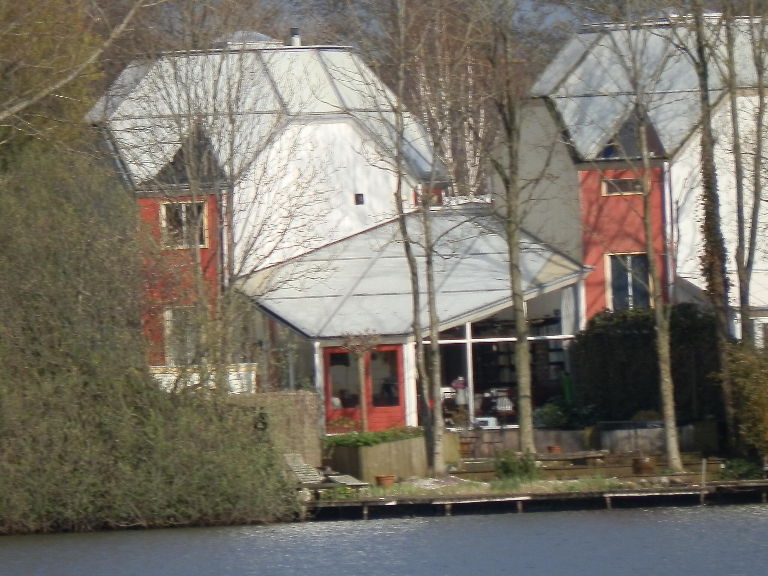 Houtskelet spiraalwoning, 8-hoekig “Afgeknotte octaëder”. Een wenteltrap is de as van het huis, iets uit het midden. Elke 4 treden een nieuwe “verdieping”. De woonkamer boven en de slaapkamers beneden. Warmte stijgt, dus de slaapkamers blijven redelijk koel, ook afgelopen zomer. Sinds 1 september ’22 “van het gas af” d.m.v. aquathermie en een water-water-warmtepomp (nu 1 jaar in gebruik: 2.250 kWh incl. warm tapwater). Veel gedaan om het huis geschikt te maken voor verwarming met de warmtepomp: isolatie dak, glas, muren van binnenuit, LT-convectoren in de woonkamer, vloerverwarming + LT-convector in de keuken.