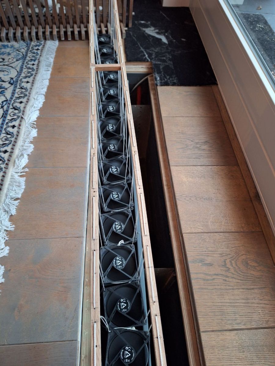 Omdat een warmtepomp water met een lagere temperatuur produceert, zijn in twee convectorputten ventilatoren geplaatst die convectie forceren en daarmee de woning verwarmen. De snelheid en daarmee het geluidsvolume en de luchtverplaatsing van deze ventilatoren zijn traploos regelbaar.