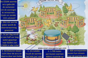 De CESAR warmte accu voorziet 36 woningen van warmte die in de zomer wordt opgeslagen in 400m3 staalslak op een temperatuur van 450 graden Celsius. Er zit bijna 2m isolatie omheen met een Rc waarde van 35 waardoor de warmte het hele jaar vastgehouden wordt. Het verwarmen van onze woning kost geen energie van buiten, geen energierekening, dus. Ook komt er geen CO2 vrij.