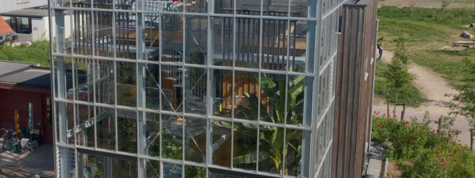 Onze kaswoning bestaat uit 2 delen: een woongedeelte van massief hout (CLT, oftewel kruislings verlijmd vurenhout) en daartegenaan en deels eroverheen een kas met gelaagd enkel glas als overdekte buitenruimte. Op deze manier wordt het houten huis deels beschermd tegen regen en wind, en hebben we een mooie lichte leefruimte voor onszelf en onze planten.