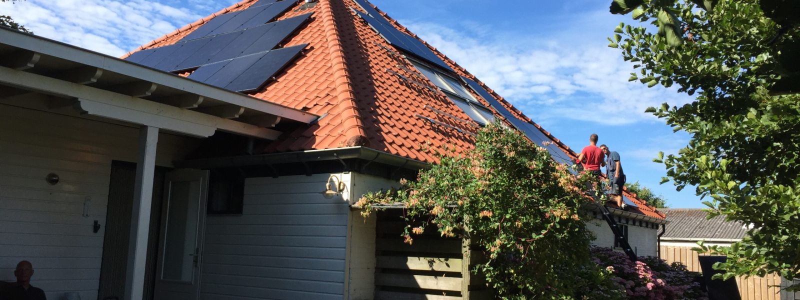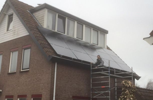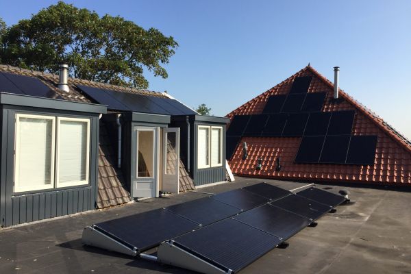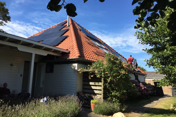 50 zonnepanelen, lucht-warmtepomp voor warm water CV en douchen, lage temeperatuur-radiatoren. Huis was al voorzien van vloerverwarming En gevels en dak waren al geïsoleerd.
