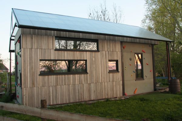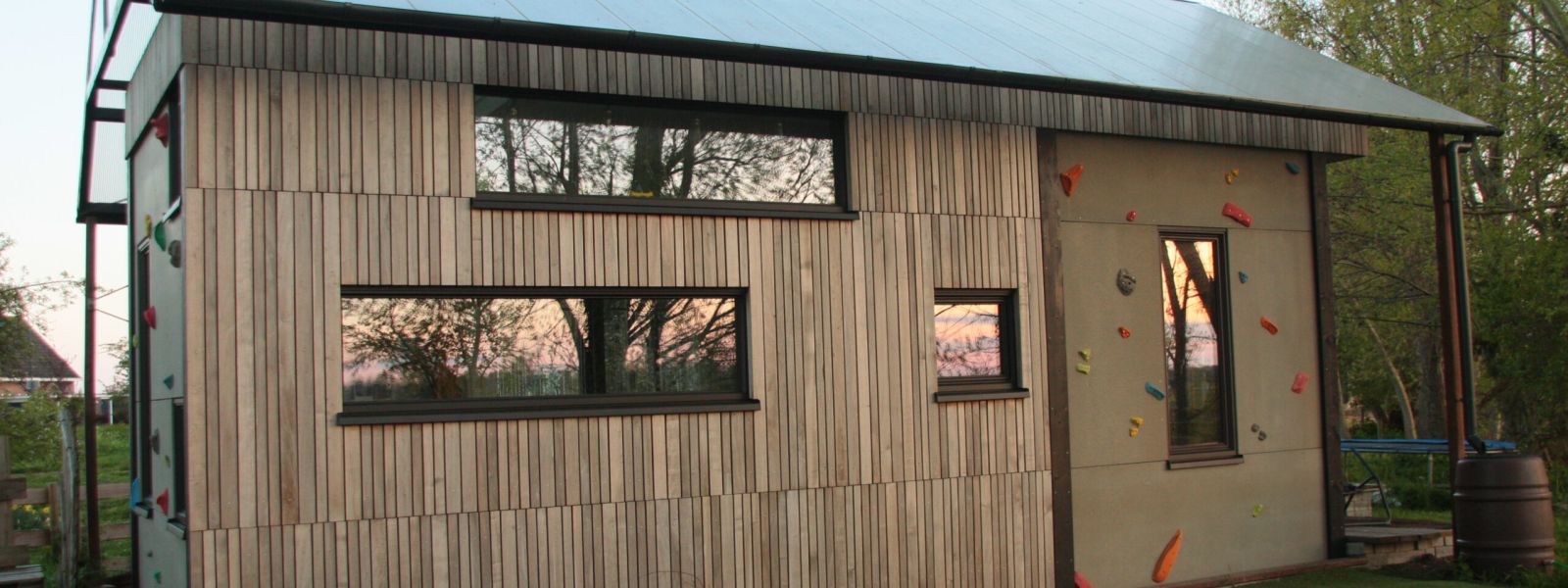 Houtskeletbouw met hoogst mogelijke isolatie in zo dun mogelijke wanden. Vloer extra geïsoleerd.