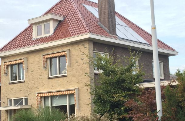 Warmtepomp voorziet in warmte, beneden met vloerverwarming, boven met radiatoren. Energie komt vanaf zonnepanelen.