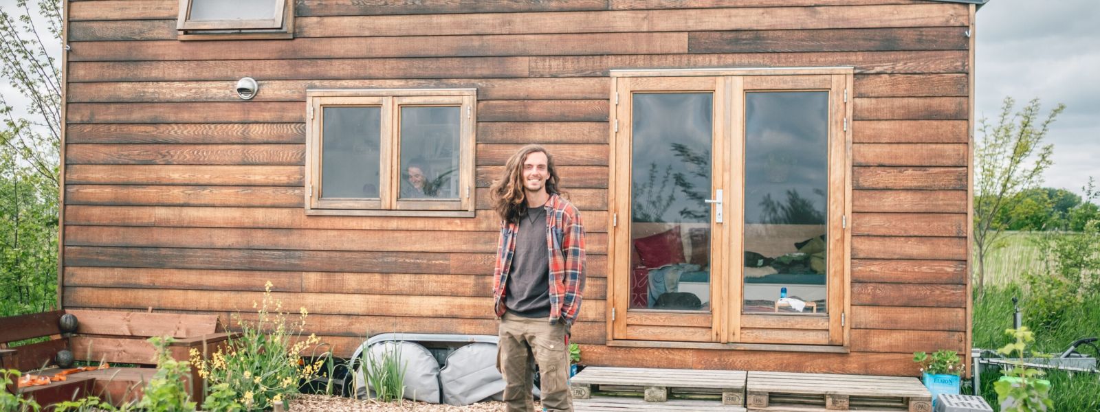 Jildau en ik (Quinten) wonen samen in een tiny house van 18m² in het jonge voedselbos van Savanne boerderij Verbaarum. Vanwege zijn kleine formaat gebruiken we heel weinig energie: we stoken op lokaal geoogst hout en verbruiken per winter maar 1-1.5 kuub. Verder gebruiken we alleen wat propaan om te douchen en koken. We eten bijna volledig uit de tuinderij die we in het voedselbos hebben gemaakt genaamd de Woldtuin, samen met de 50 gezinnen die lid zijn en wekelijks hier hun groenten komen halen.