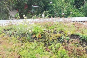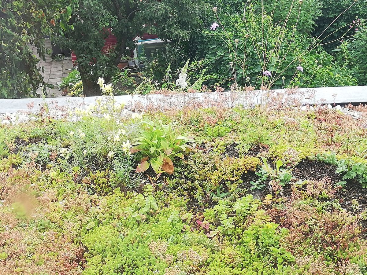 Het groene dak bestaat grotendeels uit sedum(rollen), met daarnaast op een klein deel droogtetolerante planten die zijn geplant op een ‘bergje’ van substraat vermengd met potgrond. Die combinatie geeft een levendig dak, dat ook vanuit de tuin zichtbaar is.