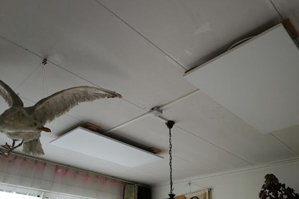 Na verwijdering van 2 Pelgrim gaskachels en 2 schoorsteenmantels zijn 2 Easy Infrarood panelen, elk 800Watt, bevestigd aan het plafond.