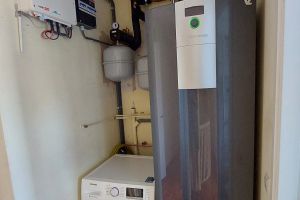 Modulerende water/water warmtepomp (6kW) (op zolder) met 6 PVT-panelen (op het dak) als warmtebron (2700 Wp) . Zie de foto’s.