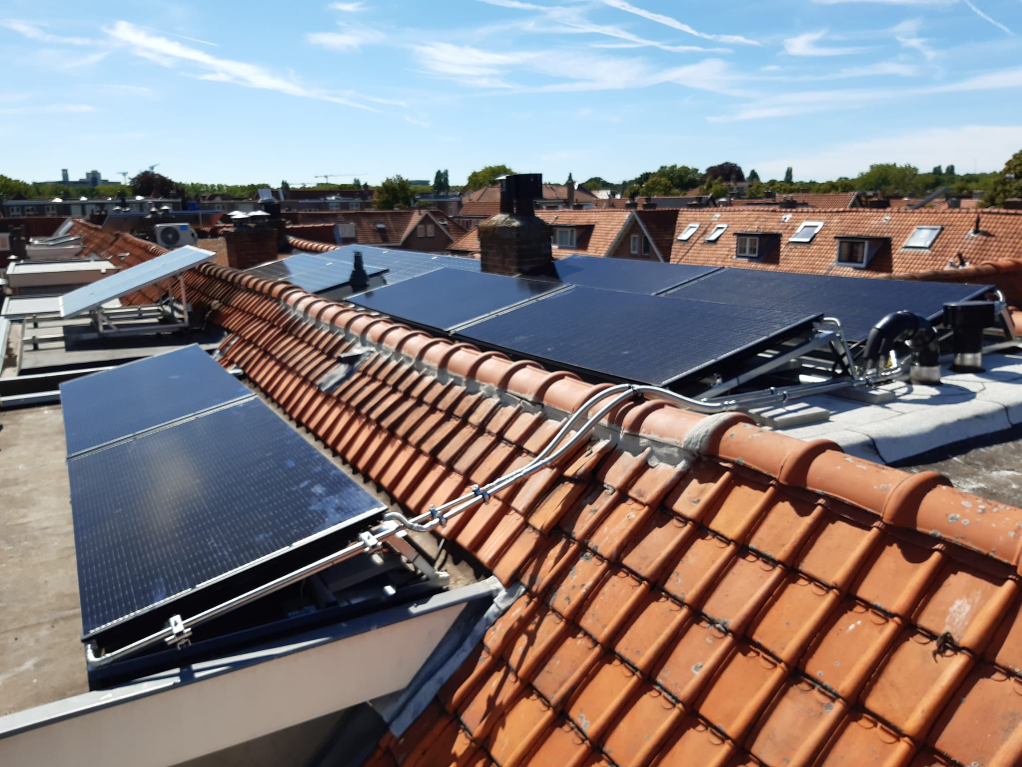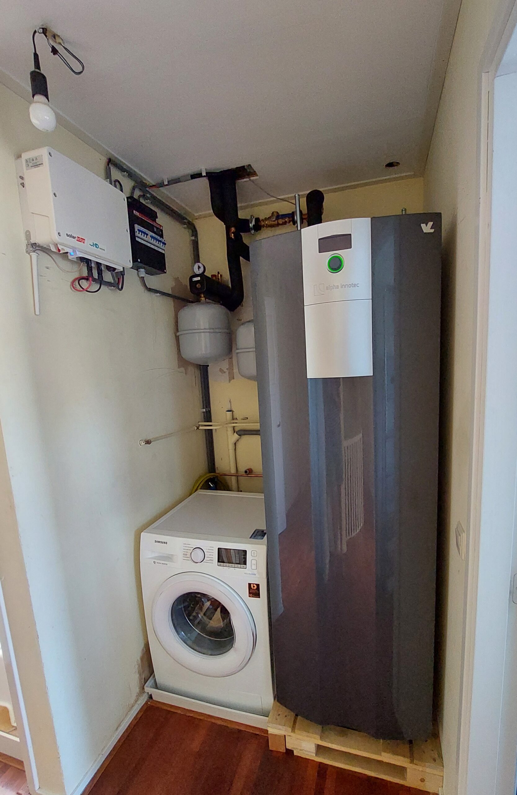 Modulerende water/water warmtepomp (6kW) (op zolder) met 6 PVT-panelen (op het dak) als warmtebron (2700 Wp) . Zie de foto’s.
