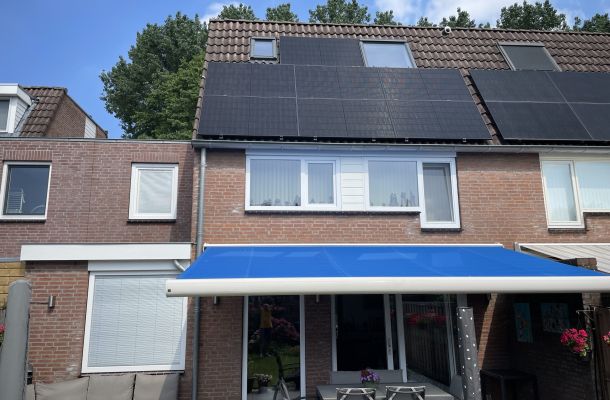 Energie voorzien door een combi warmte pomp systeem, zonnepanellen en batterijsysteem.