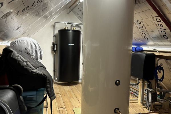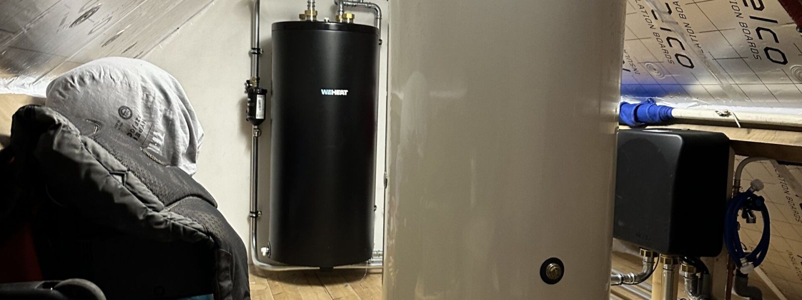 Sinds november 2024 draait de all-electric WeHeat-warmtepomp op de dakkapel, inclusief een 200-liter boilervat dat op de vliering is geïnstalleerd. Ideaal, omdat dit eigenlijk geen extra ruimte in de woning kost — in tegenstelling tot de cv-ketel, die in ons washok behoorlijk in de weg stond.