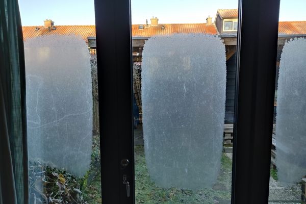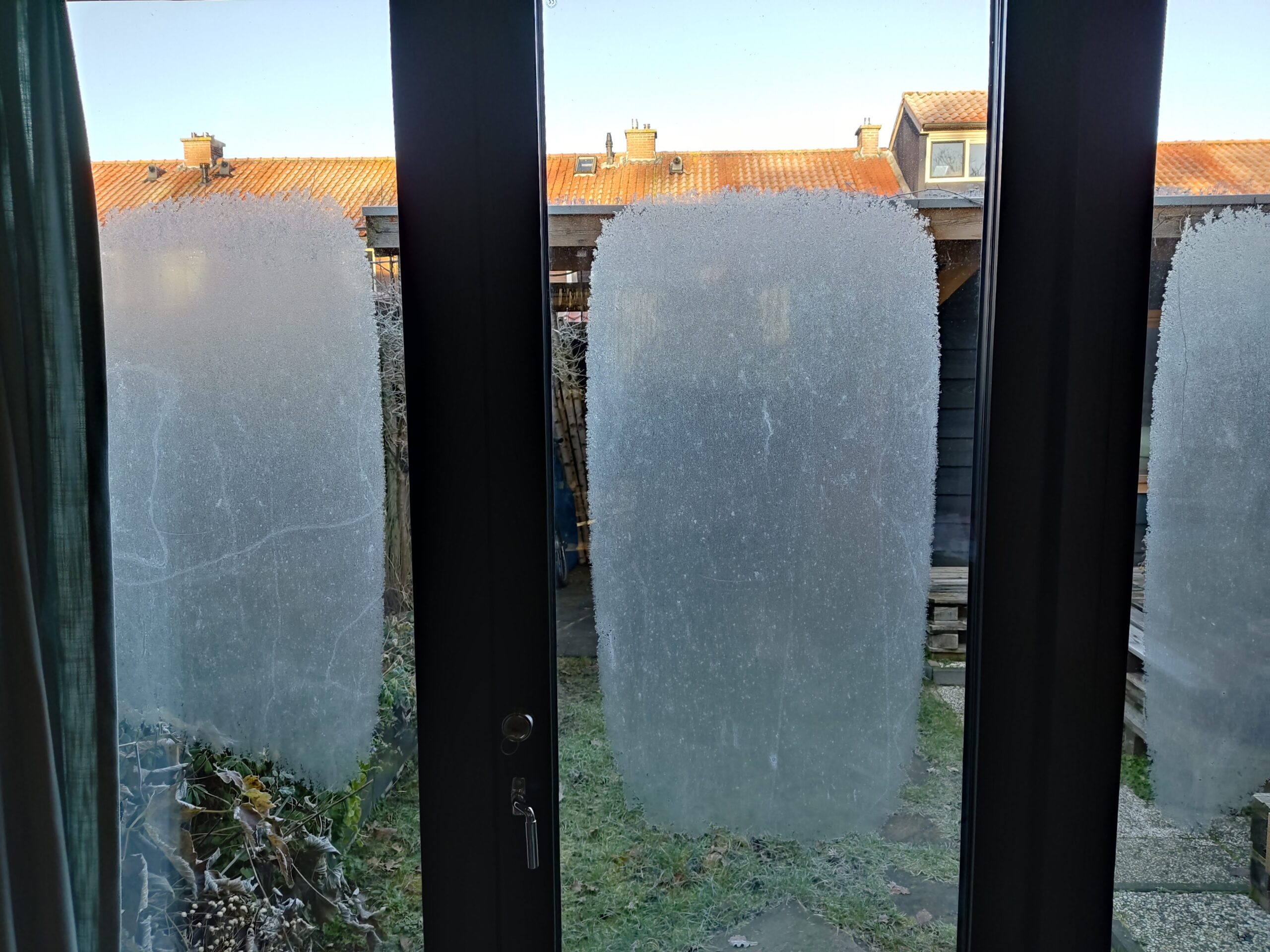 In de winter staat er buiten ijs op het raam terwijl het binnen 20-21 graden is.