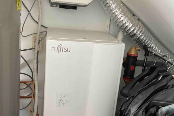 Gas afgesloten, geheel elektrisch. Alleen begane grond middels vloerverwarming verwarmd met luchtwarmtepomp (Fujitsu). Boven alle verwarmingen en leidingen verwijderd, passieve restwarmte is voldoende voor slaapkamers. 22 Avancis-zonnepanelen à 145 Wp (vrijwel plat onder afschot: voor de esthetiek) op de schuur en 12 Canadian Solar Mono Black à 310 Wp op de voorkant van het huis. Extra groene stroom uit 3 Windmolen-aandelen. Warm water van luchtwarmtepomp-boiler op voorzolder (300 liter, zuigt lucht af uit woning). HR-houtkachel voor als het echt koud is. Uiteraard alles LED en zuinige apparaten.
