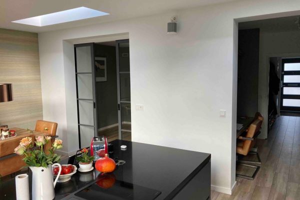 Tempex onder nieuwe betonnen woonkamervloer en van binnenuit geïsoleerde zolder. Enkelglas op de eerste verdieping vervangen voor HR++ in bestaande alu-kozijnen. Triple glas in schuifpui en lichtstraat aanbouw. Oude dubbelglas-voorraam vervangen voor triple glas (in oude houten kozijn). Kurkvloer op verdiepingen.