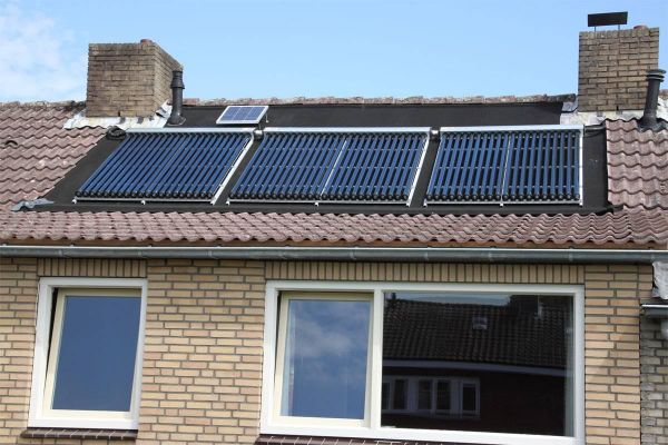 Lage temperatuurverwarming d.m.v. zon en biomassa; gasketel vervangen door L/W warmtepomp. – Zon-aangedreven collectorpomp.
