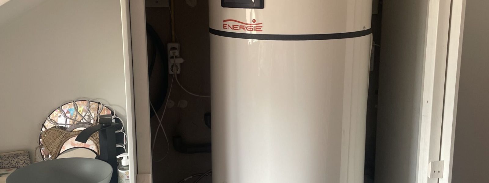 Warm water in de keuken d.mv qooker en douchewater wordt verwarmt door de warmtepompboiler.
