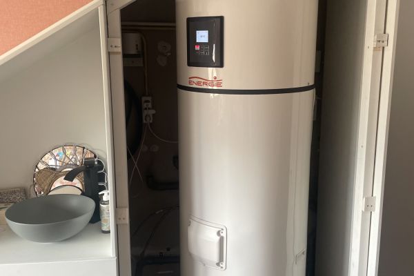 Warm water in de keuken d.mv qooker en douchewater wordt verwarmt door de warmtepompboiler.