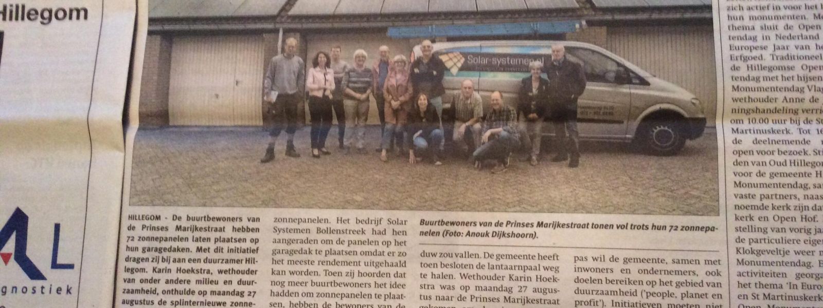 De buurtbewoners van 7 woningen aan de Prinses Marijkestraat hebben gezamenlijk gekozen voor duurzame energie via zonnepanelen. Verdeeld over zeven garagedaken zijn 72panelen geplaatst. Omdat dit gezamenlijk is gebeurd heeft dit geleid tot een mooi geheel.