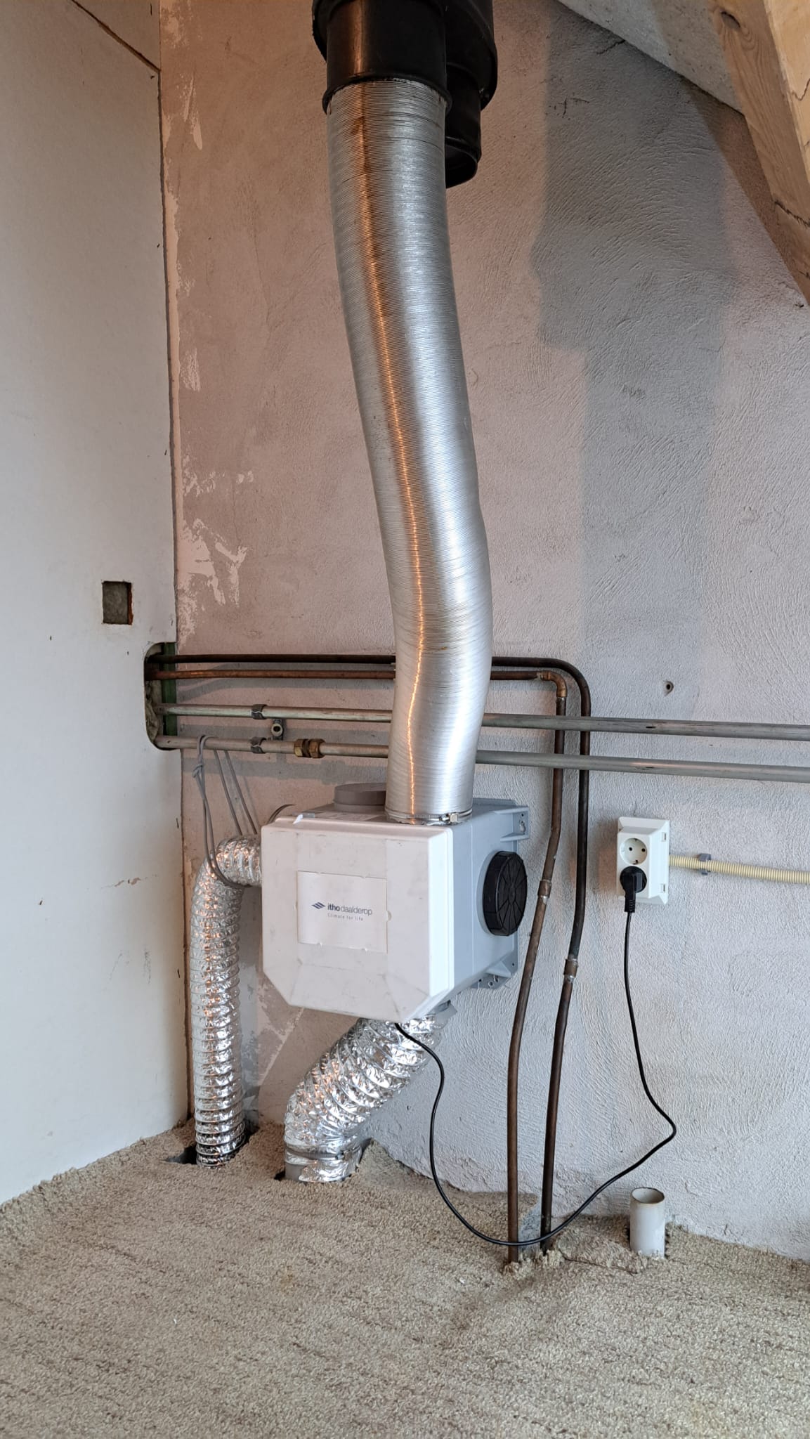 Een centrale unit die zowel de badkamer op de 1e etage als het toilet op de BG afzuigt.