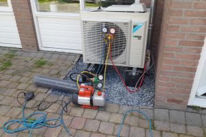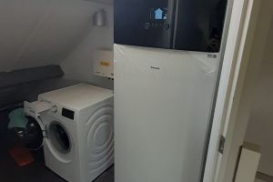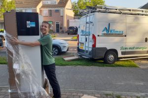 Full-electric lucht/water-warmtepomp van installatiebedrijf Klimax. De buitenunit staat naast de voordeur en onttrekt warmte uit de buitenlucht. De binnenunit staat op zolder (waar daarvoor de CV-ketel hing) en geeft de onttrokken warmte af aan de radiatoren. Daarnaast bevat de binnenunit de regeltechniek en het vat voor warm tapwater (230L).