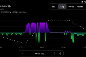 Wij hebben bewust gekozen voor een kleine batterij: 800W en 2,7 kWh. Voordeel van een kleine batterij is dat we deze ook in de winter (bij weinig zon) sneller vol krijgen, en ook in de zomer alsnog leegkrijgen met ons nachtelijke basisverbruik (van ventilatie, koelkast, vriezer, etc.). Een grotere batterij zouden we in de winter vaak niet vol krijgen en in de zomer vaak niet leeg krijgen. Dan is de meerwaarde heel beperkt, maar zijn de kosten en milieuimpact wél hoger.