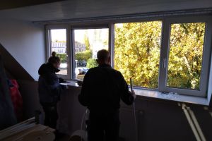 Wel de dakramen op zolder laten weg timmeren om de panelen in een geheel te kunnen leggen in plaats van om de dakramen heen.