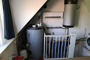 Warmtepomp in de voortuin voor verwarming en koeling. Gehele huis voorzien van vloerverwarming/vloerkoeling. Fancoilunits voor ontvochtiging en koeling. Warmwater door ventilatiewarmtepompboiler. 3900Wp zonnepanelen.