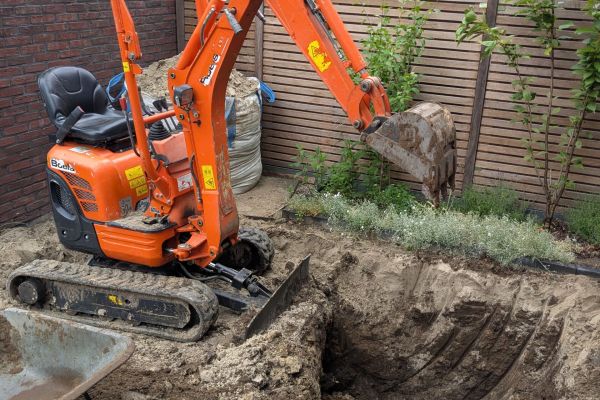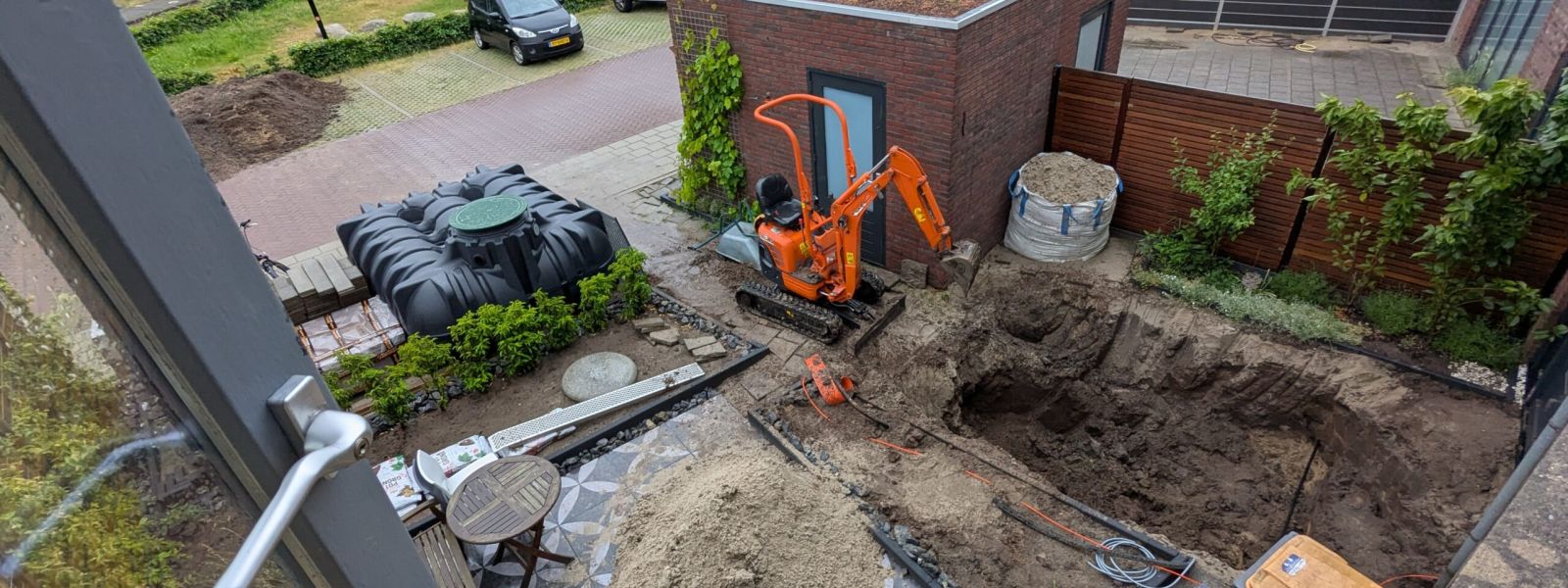 In de voortuin is een regenwatertank geïnstalleerd, waarmee waterbesparing gerealiseerd wordt voor doorspoelen van de toiletten in huis, bij het wassen en bij het sproeien van de voor- en achtertuin in droge tijden.