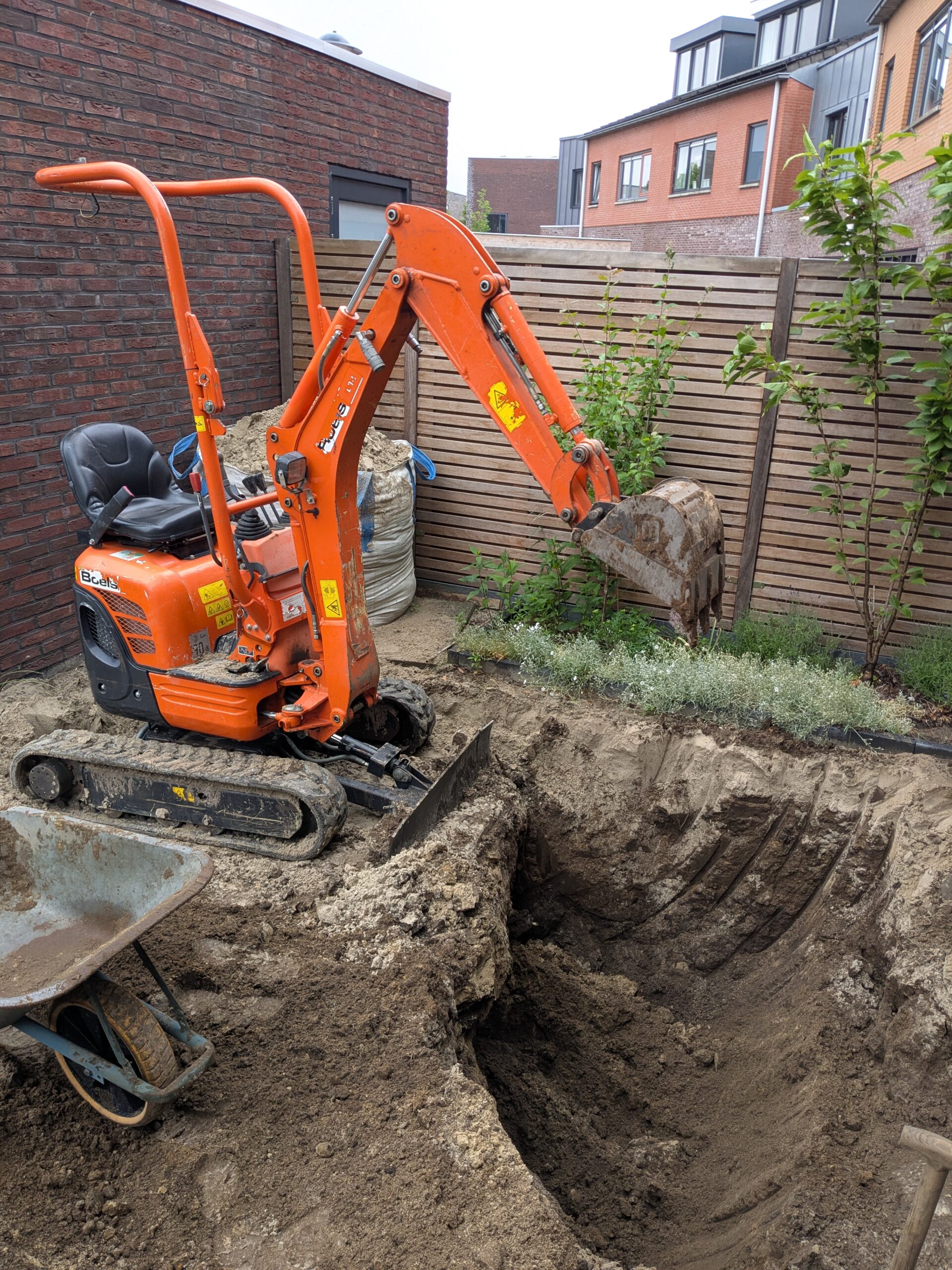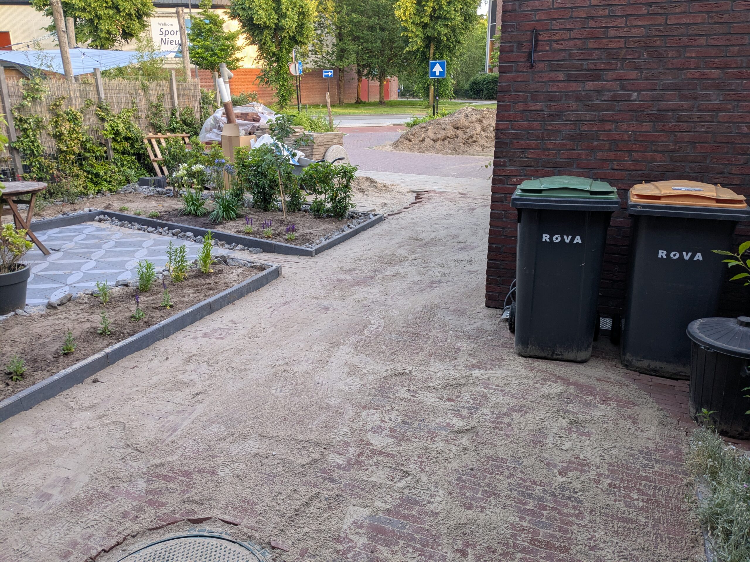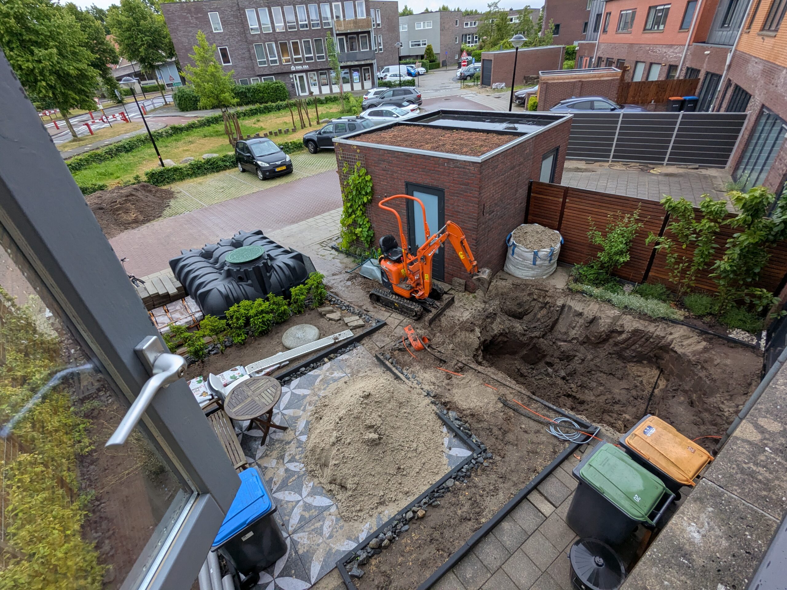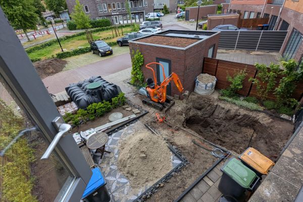 In de voortuin is een regenwatertank geïnstalleerd, waarmee waterbesparing gerealiseerd wordt voor doorspoelen van de toiletten in huis, bij het wassen en bij het sproeien van de voor- en achtertuin in droge tijden.