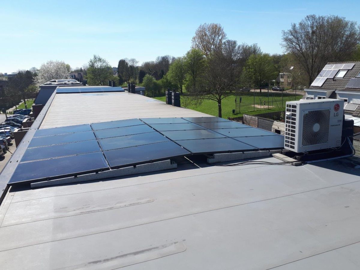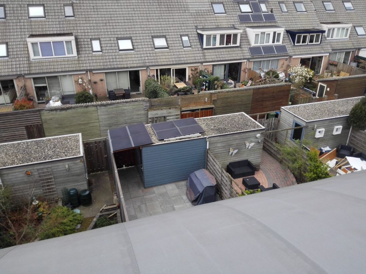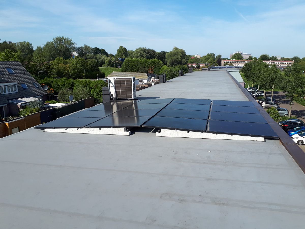In een eerste fase op het platte dak 12x SF170-S geplaatst in een Oost-West opstelling middels Flatfix Fusion op een Hosala Bright 2000 MTL. Het zijn twee strings parallel van drie panelen in serie per MPPT (2x 2×3) onder een hoek van 13 graden. Door nieuwe inzichten in de zomer van 2019 besloten om de opstelling aan te passen. Technisch was het mogelijk om het dakoppervlak nog efficienter te benutten. De 4,5 graad betonvoeten van de schuur inclusief de panelen zijn verhuisd naar het dak. Nog 7 betonvoeten bijgekocht om de opstelling aan te passen naar 2x 2×4 maar dan meer richting Zuid-Oost en Noord-West gelegd. De omvormer kan deze belasting meer dan prima aan dus deze hoefde niet aangepast te worden. De schaduw die de warmtepomp een beetje gaf was door de verdraaiing van de opstelling ook direct opgelost. Het totale gewicht is wel toegenomen maar de gemiddelde belasting per m2 is nog steeds onder de 30kg/m2. De overgebleven onderconstructie weer verkocht aan een kennis zodat hij zijn garagedak kon vol leggen. Netto is er een SF paneel overgebleven maar kan prima gebruikt worden als reserve en de te korte stabilisatoren van de Flatfix Fusion set. Aangepaste opstelling te volgen op (16x SF): http://pvoutput.org/aggregate.jsp?id=34018&sid=3206 De berging achter het huis verbouwd zodat hier 8x SF170-S panelen geplaatst konden worden op een Hosola Smart 1000 TL. Het zijn twee strings parallel van vier panelen (2x 4) onder een hoek van een kleine 4,5 graden. Inmiddels in de zomer van 2019 aangepast naar een afdak met 3 SF-panelen. Op de schuur zelf nieuwe betonvoeten van 7 graden en 4x 325Wp Jinko panelen (JKM325M-60-V) op een APS-QS1 omvormer. Daar is nu ook elke centimeter benut mede door het aanpassen van de bevestiging. Aan de zijkanten van de panelen zijn hoekbeugels gemonteerd waarna deze aan de zijkant van de betonvoeten zijn bevestigd om zo binnen de erfgrens te blijven. Opbrengst gedeeltelijk nog te volgen op (3x SF): http://pvoutput.org/aggregate.jsp?id=34018&sid=44518
