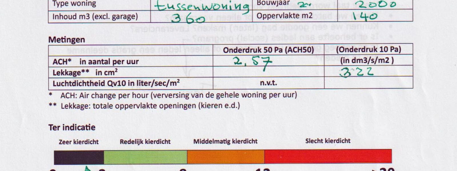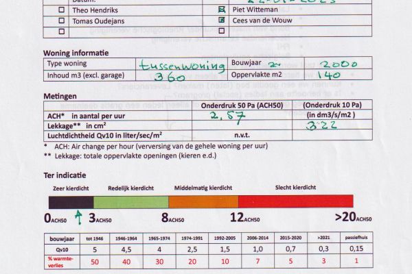 Begin 2025 heeft de energiecorporatie “Duurzaam Riel en Goirle” een doorblowertest in ons huis uitgevoerd en dat is zeer goed dicht. Zie bijgaand rapport. Ik heb nu voldoende ventilatie om mijn huis luchttechnisch gezond te houden en hoef geen verdere kierenjacht te organiseren. Wij hebben 20 zonnepanelen, deze liggen zuid/oost (145 º). Als ik ze opnieuw zou laten aanleggen, zou ik liever voor een oost/west opstelling kiezen. Betere verdeling over de dag en beter voor de net belasting.