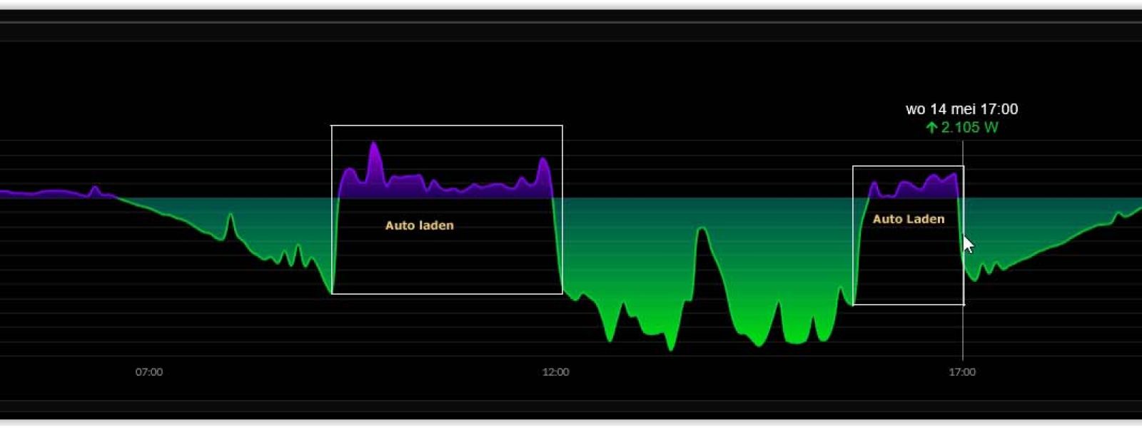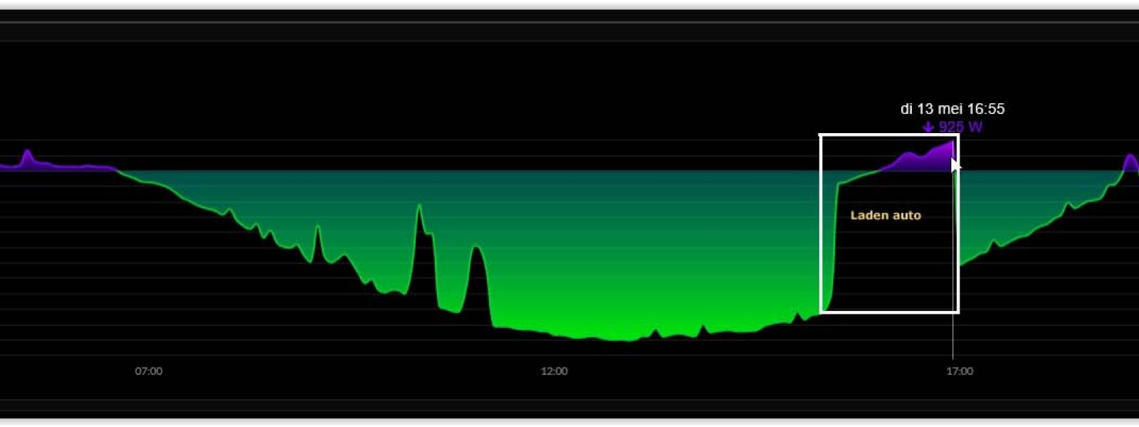 Ik heb een volledig elektrisch auto. Die probeer ik zo optimaal mogelijk te laden met stroom die van mijn panelen komen. Dat doe ik door zo veel mogelijk te laden tussen 9 en 17 uur. Ik kan in mijn auto instellen met wat voor vermogen ik laad. Tussen 6 en 32 A. Ik ga zo laag mogelijk zitten (6A) om optimaal van mijn panelen te kunnen laden. Bij 6 A levert de laadpaal ongeveer 4.500 Watt aan mijn auto. Bij volle zon leveren de panelen 7.000 Watt; ik hou dus nog wat over voor de rest van ons huishouden. Zie de twee grafieken bij de afbeeldingen. Ik heb in mijn laadpaal een tijdsprogramma, die automatisch laadt tussen 9 en 17 uur. Als om 17 uur de auto nog niet vol is, dat de paal de volgende morgen weer verder.