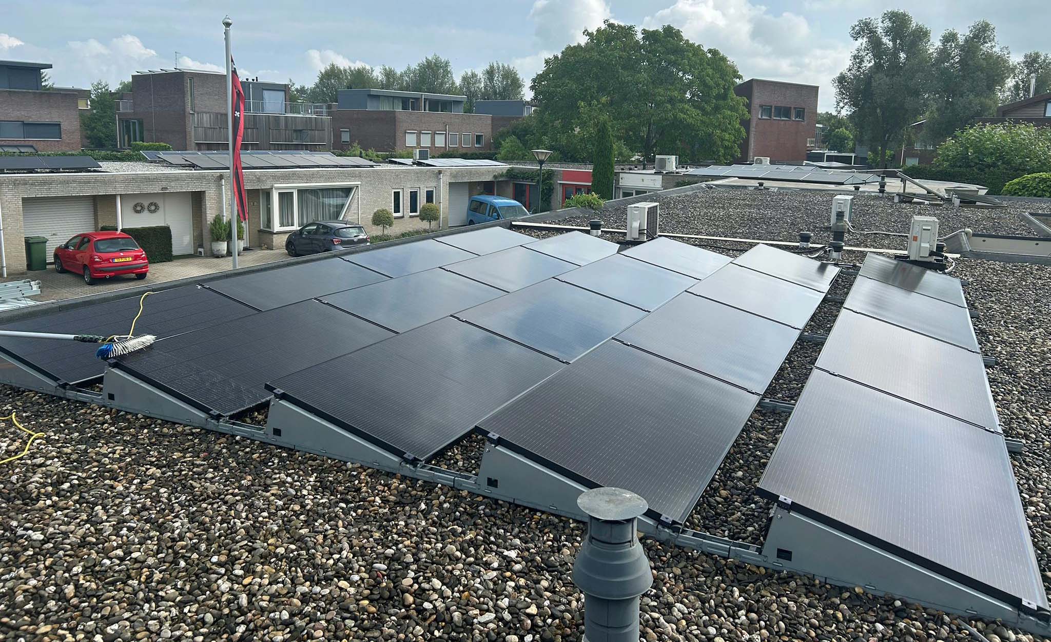 Wij hebben 20 zonnepanelen, deze liggen zuid/oost (145 º). Als ik ze opnieuw zou laten aanleggen, zou ik liever voor een oost/west opstelling kiezen. Betere verdeling over de dag en beter voor de net belasting.