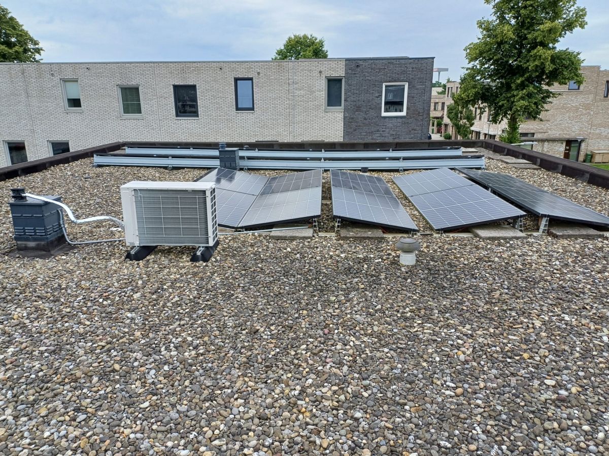 All electric warmtepomp (Samsung EHS R32 Split A2W 4,4kW), i.c.m. 10 oost-west geplaatste zonnepanelen, plus 2 zonnepanelen met stekker, op het schuurdak. Samen 4,44 kWp.