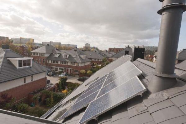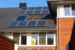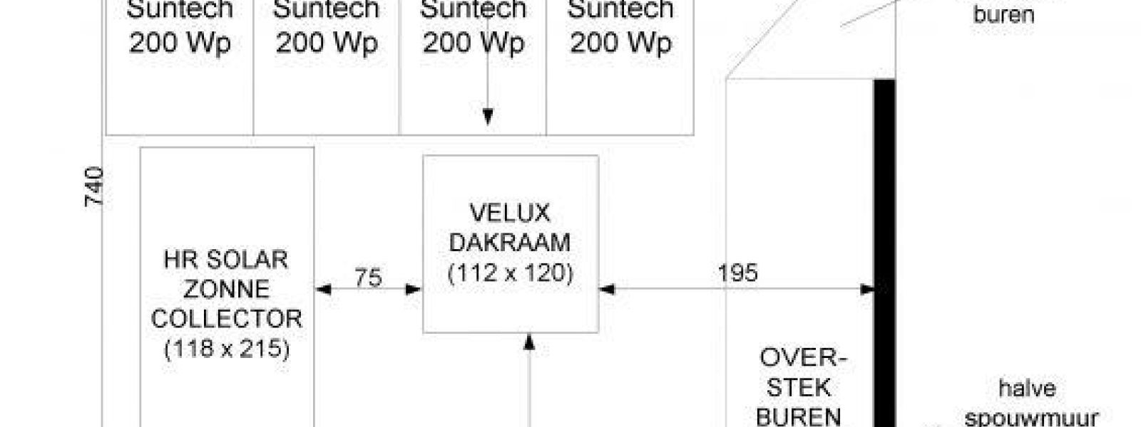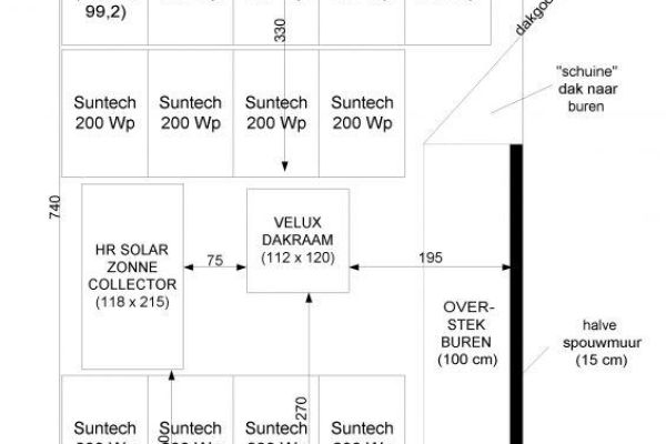 CO2-neutrale tussenwoning. We startten in 2007 met een EPC = 0,72 woning. Vervolgens hebben we in 2008 een zonnecollector laten monteren. Helaas nog niet direct rekening gehouden met de zonnepanelen die later zouden volgen. Dat werd aardig puzzelen met de ruimte op het dakvlak, zie het schetsje. Uiteindelijk lukt het om 13 panelen op het dakvlak en 3 panelen op de uitbouw te laten plaatsen. Het elektriciteitsgebruik hebben we fors teruggebracht tot ca. 1700 kWh per jaar door de installaties te optimaliseren (WTW, pompschakeling op vloerverwarmingspompen, hotfill op wasmachine). Hierdoor leveren we netto 1000 kWh/jaar aan het net. Als laatste stap naar CO2 neutraal is in 2010 een houtkachel gemonteerd.