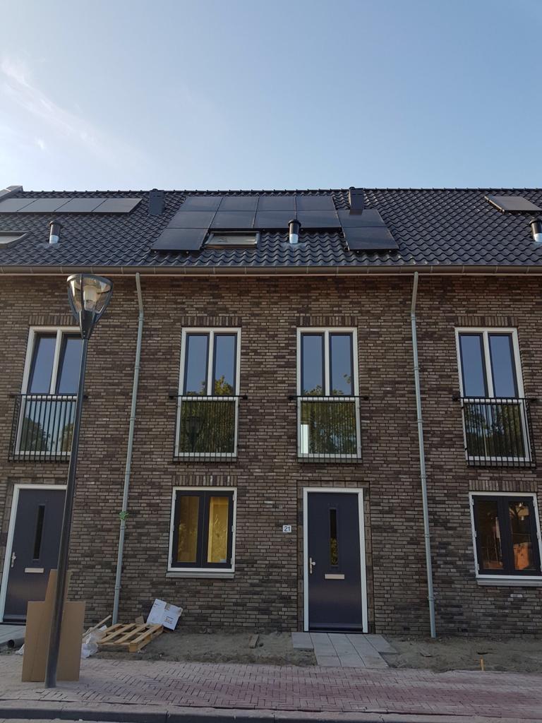 Nieuwbouwwoning met zonnepanelen, warmtepomp, boilervat en zonnecollector.