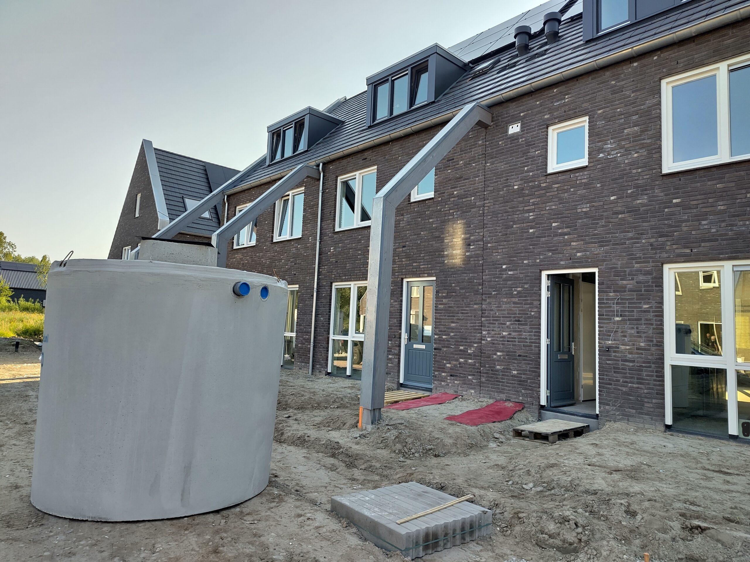 Wij hebben na oplevering van de nieuwbouwwoning een regenwateropvangsysteem in de voortuin aangelegd om regenwater te gebruiken voor WC en wasmachine.