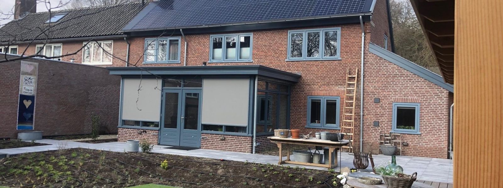 Nieuw dak, 8kW PV geïntegreerd, bron/water WP, Co2 gest. balansventilatie, BG uitgegraven/geïsoleerd, vloerverw. op BG en 1e verd., blowerdoortest, thermografie, van gas los, sfeerhaard op propaan en 10M3 regenwatertank ingegraven voor bereging en toiletspoelen, spouwvulling 2x en speciale kierdichting.