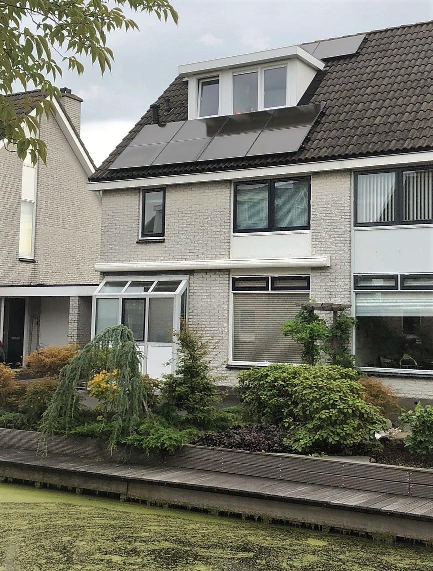 Zonnepanelen hebben een gunstig bijeffect doordat directe zoninstraling op de onderliggende dakconstructie wordt voorkomen, dat scheelt al gauw een paar graden opwarming.