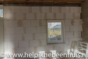 In totaal zijn we zes dagen bezig geweest met het lijmen van de blokken. Steeds werkte de stukadoor met een van ons twee als handlanger. Per muur was het ongeveer een dag werk, maar zoals vaak het geval is gaat ook nog veel tijd zitten in de kleine stukjes en hoekjes. En vergeet ook niet de de schuine ‘verloopstukken’ voor de overgang naar de binnenwanden. En alle randjes afdichten met PUR-schuim, etc. etc! De volgende stap is ‘ingazen’: een gaaslaag over de muur plakken en die afstuken met dezelfde basismortel. Daarover kan nog een normale, fijne stuklaag, maar we vonden het zo al heel mooi. Een beetje grof voor beneden, maar voor boven laten we het zo!