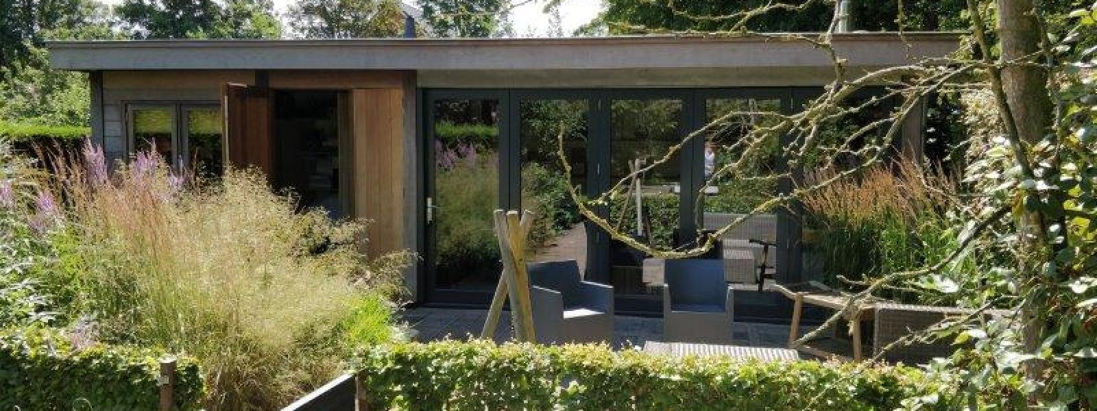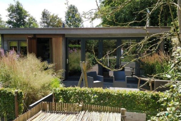 Tuinhuis voorzien van een warmtepomp boiler en 8 zonnepanelen op noord en zuid.