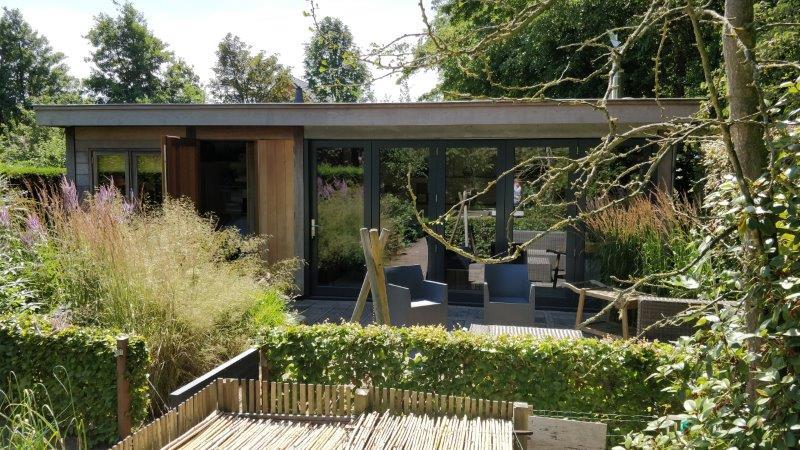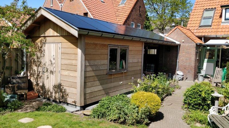 Tuinhuis voorzien van een warmtepomp boiler en 8 zonnepanelen op noord en zuid.
