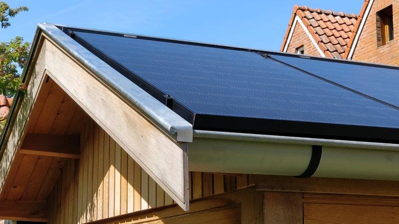 17 Zwarte kleurige zonnepanelen geintregeerd in zadel dak van schuur en Veranda. (8 stuks op het oosten en 9 stuks op het westen)