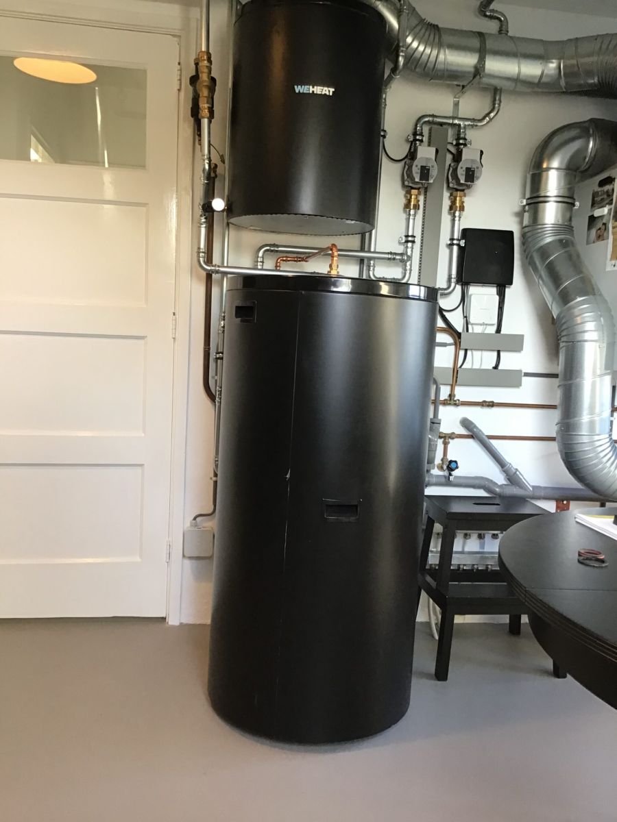 Onze keuze is gevallen op de Blackbird 8 KW all electric van fabrikant Weheat. Het is geplaatst met behulp van een grote hijskraan op het platte dak van de dakkapel aan de achterzijde van het huis. Voor een efficiente werking is een buffervat van 50 liter geplaatst. Voor de warm tapwater voorziening is een boiler geplaatst van 200 liter.