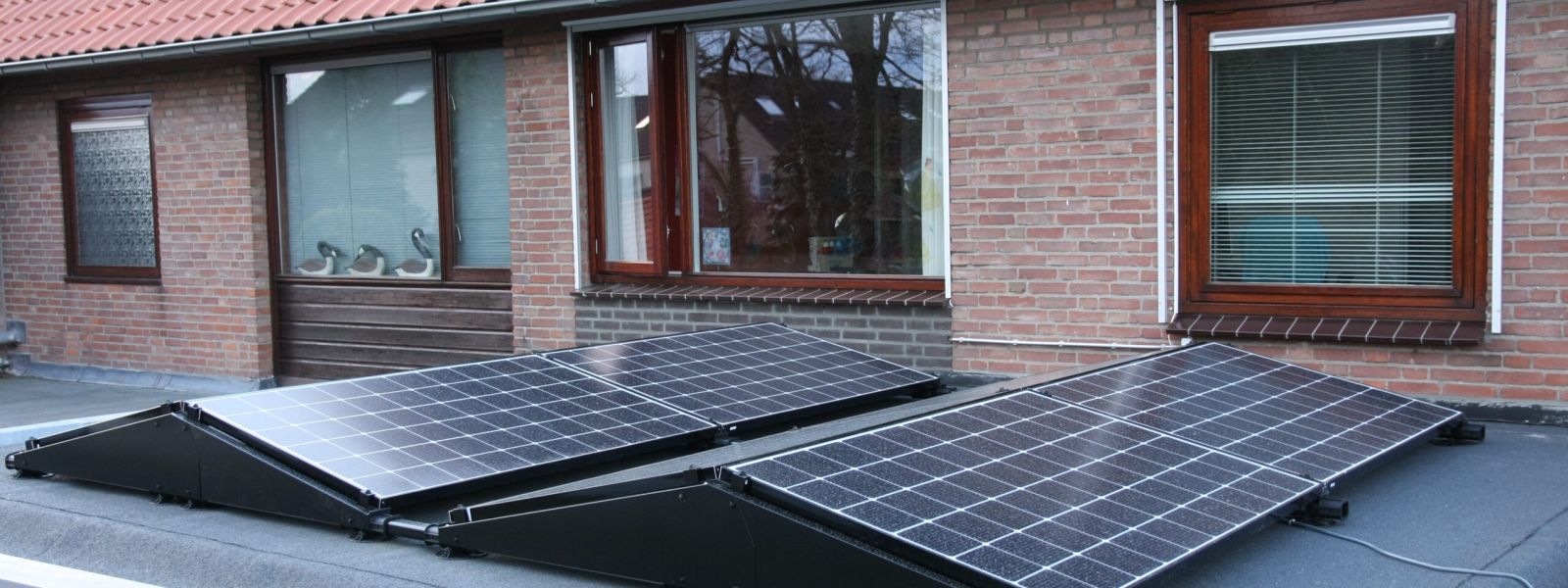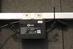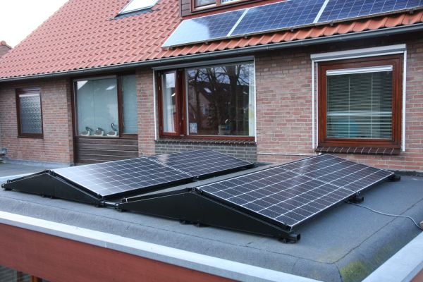 In 2016 zelf geplaatst op plat dak uitbouw (13°, oost/west-opstelling): 8 panelen (13 m2, monokristallijn, LG, APS micro-omvormers) met een vermogen van 2200 Wp en een jaaropbrengst geschat op 1800kWh.