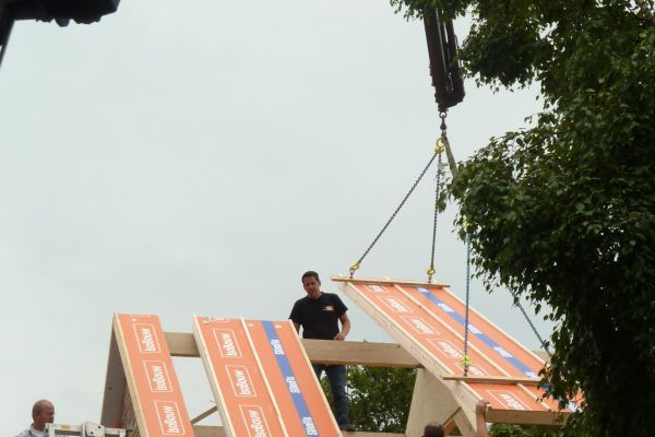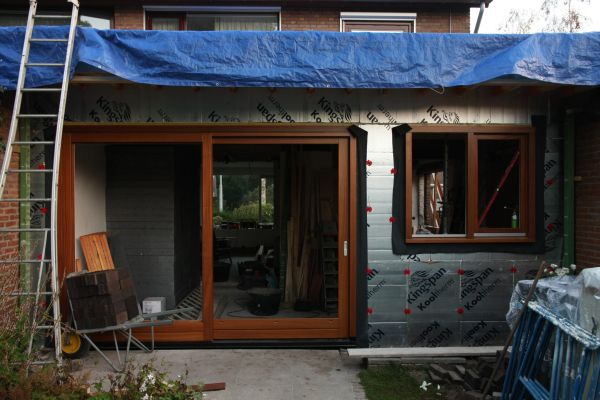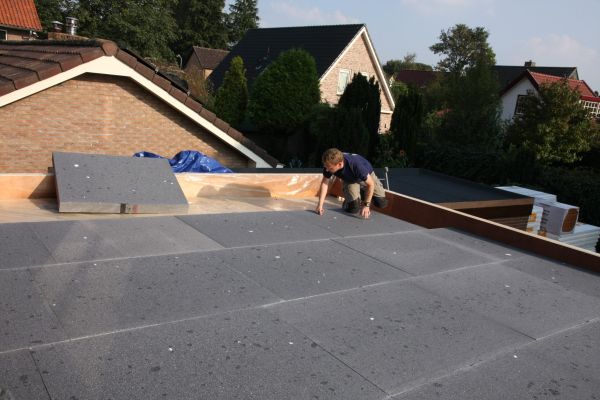 Zolder is geïsoleerd met EPS dakelementen (Rc = 3 m2.K/W); uitbouw is geïsoleerd met EPS isolatieplaten (2x 10 cm, Rc = 6 m2.K/W)