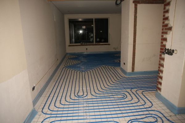 EPS isolatieplaten (2x 10 cm, Rc = 6 m2.K/W) tussen betonvloer (direct gestort op zand) en zandcement-dekvloer (met vloerverwarming).