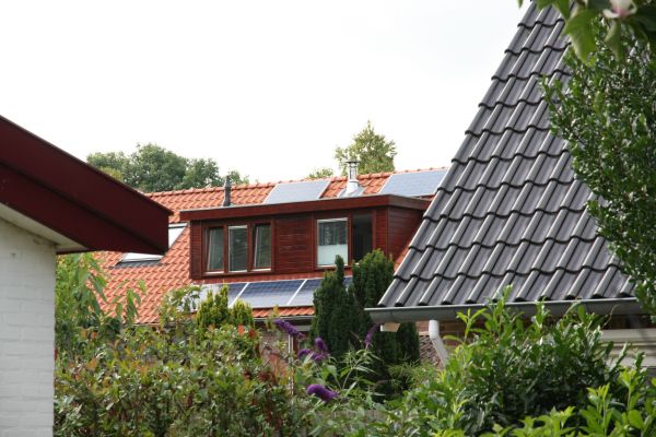 In 2012 laten plaatsen op schuin dak (40°, zuid-opstelling): 5 panelen (8 m2, polykristallijn, Canadian Solar, SMA omvormer) met een vermogen van 1200 Wp en een jaaropbrengst van gemiddeld 1020 kWh.