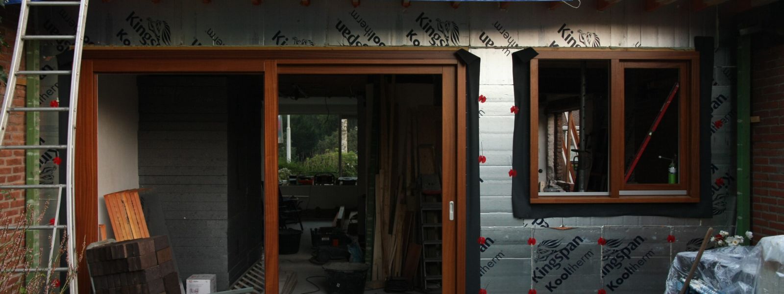 Termokorrels (6 cm laagdikte, Rc = 1.7 m2.K/W) in oorspronkelijke spouw en hardschuim isolatieplaat (8 cm laagdikte, Rc = 4 m2.K/W) in uitbouw.