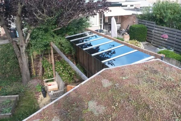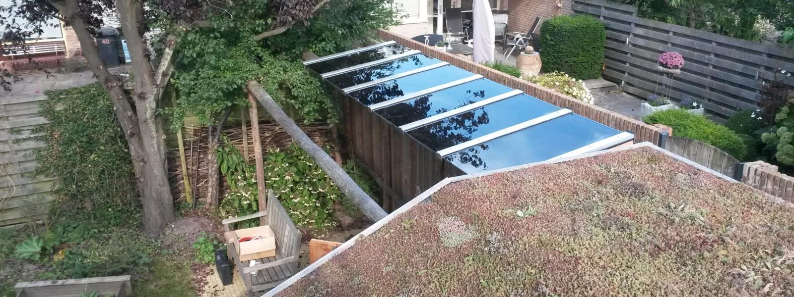 Nu ook lichtdoorlatende zonnepanelen als veranda/afdak achter in de tuin: schaduw, afdak en ook nog elektriciteit produceren. Wat wil je nog meer? Huis is gebouwd in 1963 en nu toch label A bereikt, mooi toch? Vorig jaar een groen dak op onze nieuwe schuur laten aanleggen.