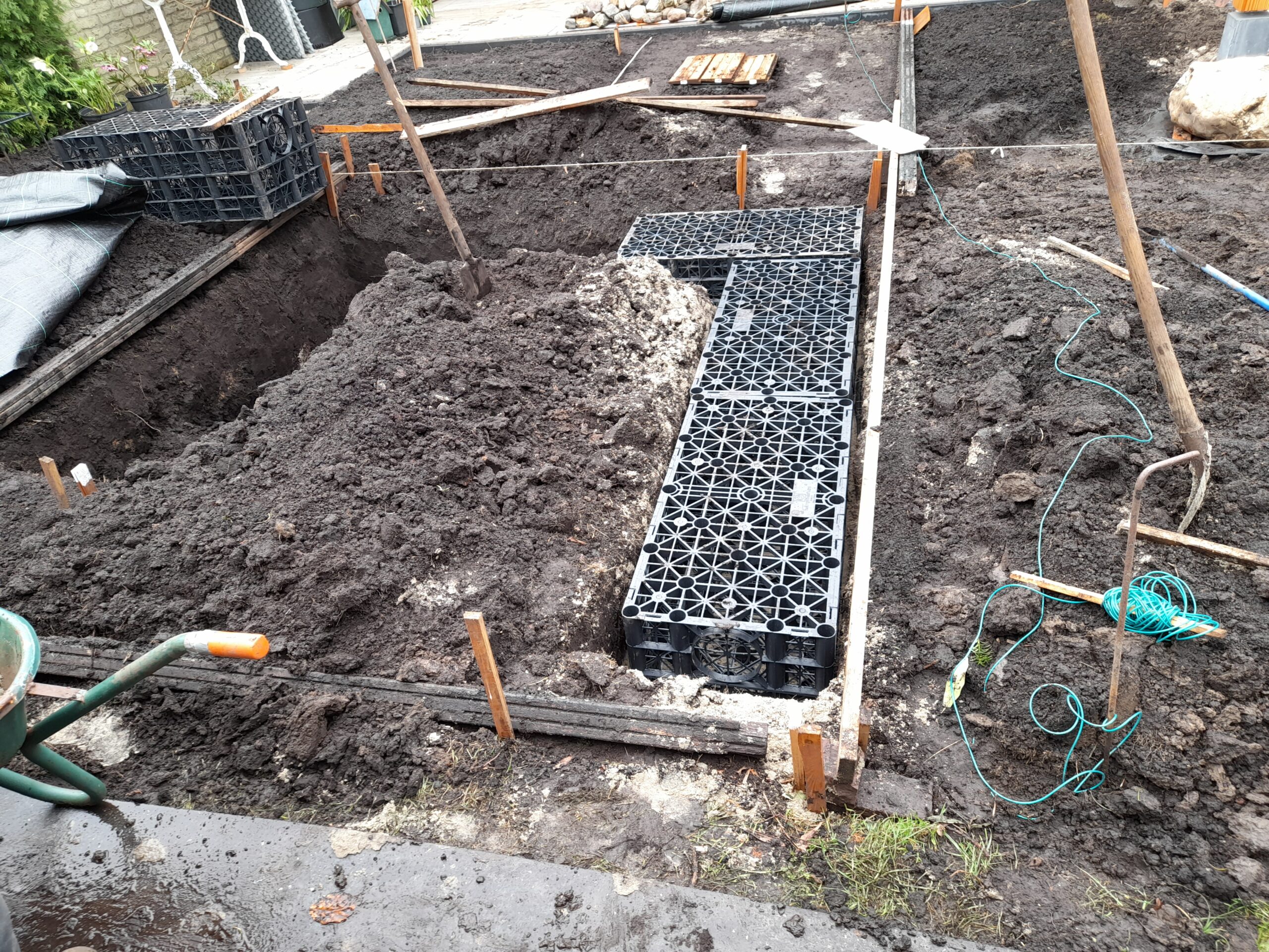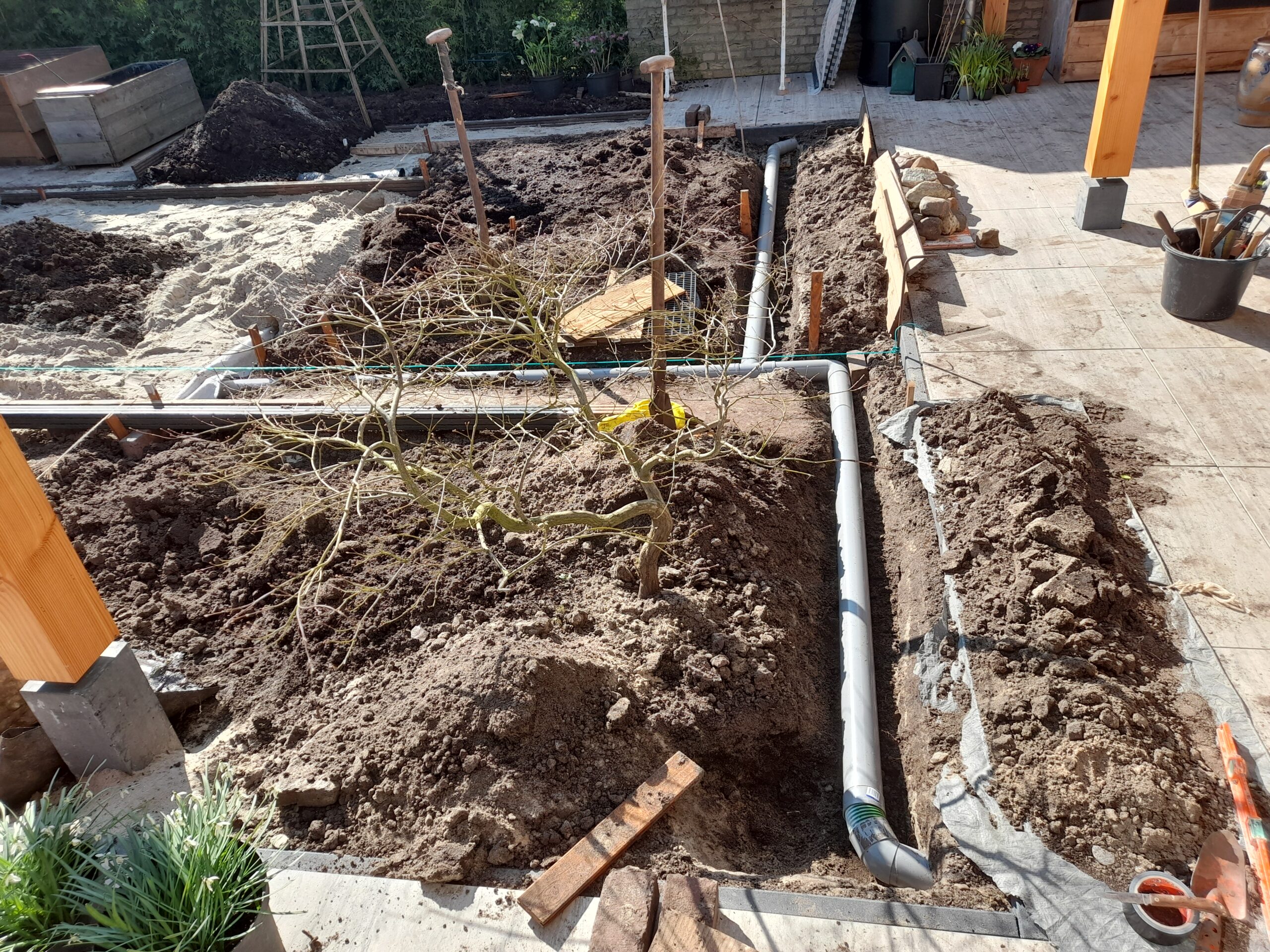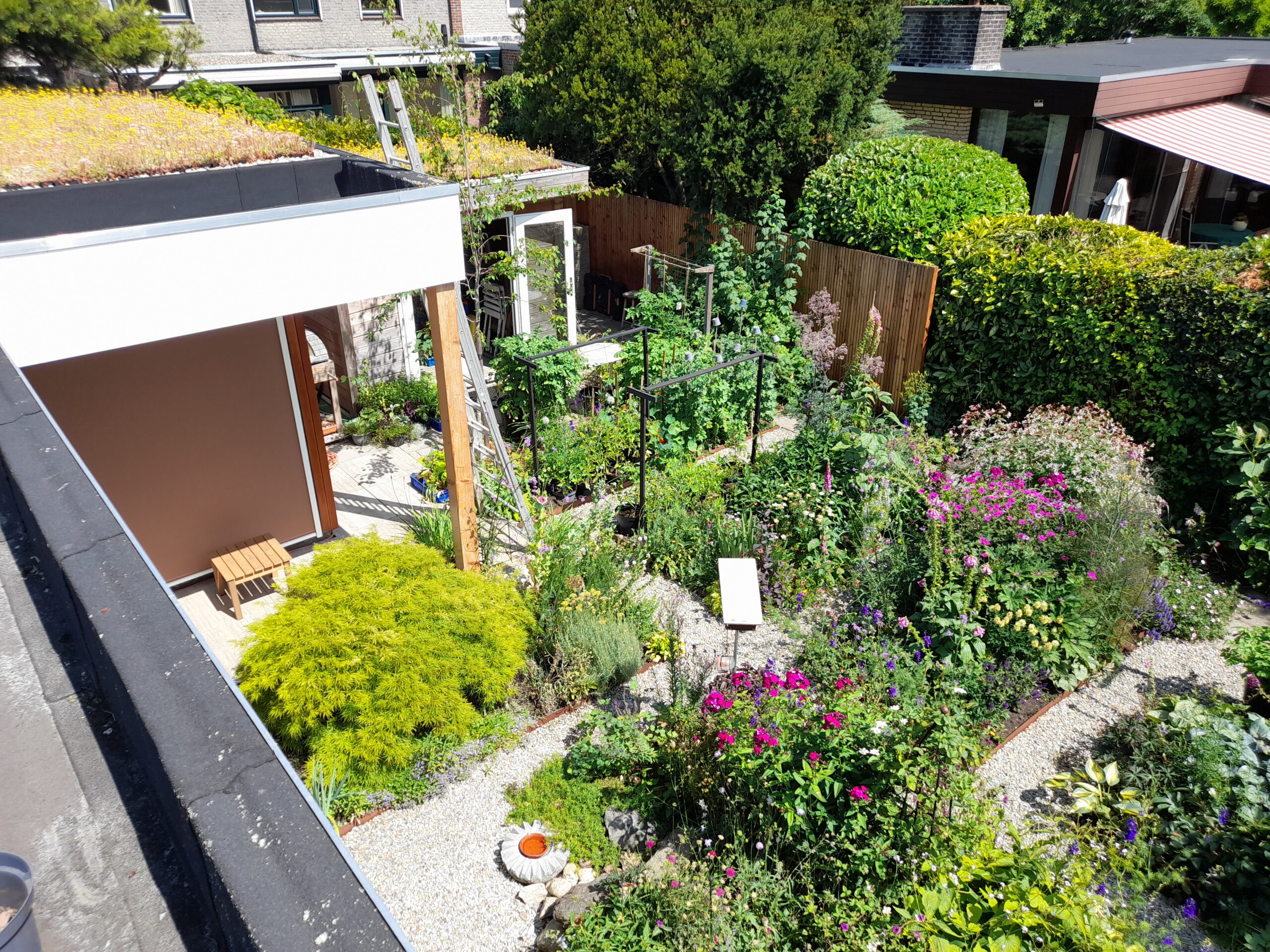 Tuin met hergebruik aanwezige tegels, wateropvang, infiltratiekratten, moestuin, veel vogels, insecten, vlinders.